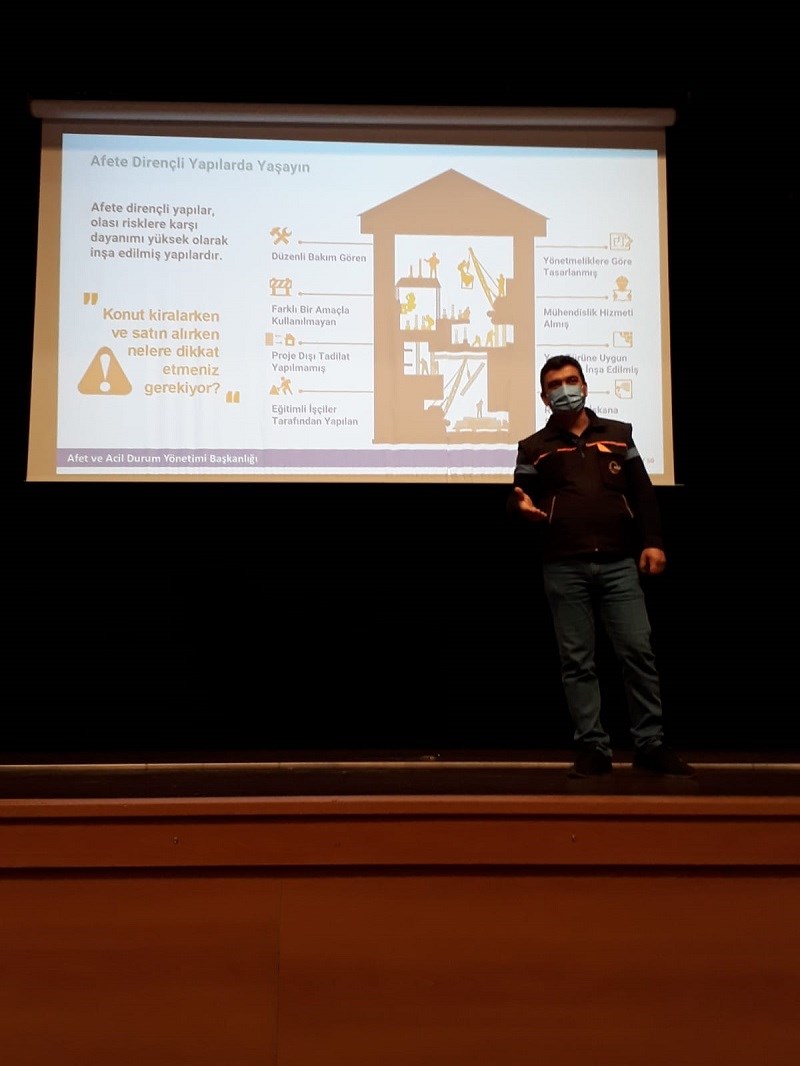 Deprem sonrası ilk 6 saatte yapılacakları anlatan kamu spotunun izlenmesiyle başlayan afet farkındalık eğitiminde; afet ve acil durum anında ilk 6 saatin önemi, bina güvenliği, tahliye ve toplanma alanları, KBRN tehdit ve tehlikeler, gönüllülük, afet sonrası doğru davranış şekilleri, afet çantası, afet ve acil durum planı, sivil savunma, DASK, afet sonrası ilk 72 saat, yaşam çevremizdeki riskler ve risklerin azaltılması, konularında katılımcılar bilgilendirilmiştir.